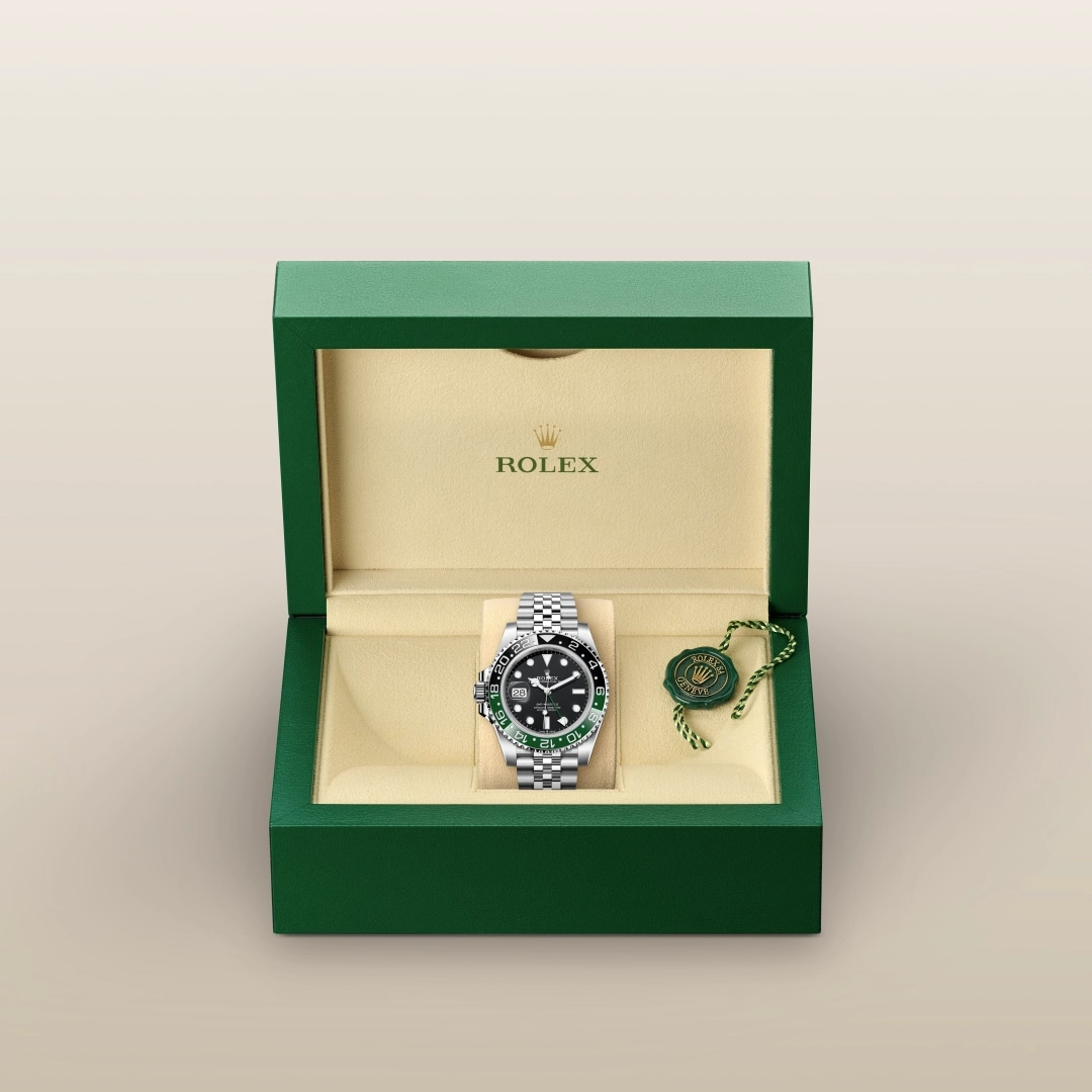 This model features a black dial and a two-colour Cerachrom bezel insert in green and black ceramic. In addition to conventional hour, minute and seconds hands, the GMT-Master II features an arrow-tipped hand, which circles the dial once every 24 hours, as well as a bidirectional rotatable 24-hour graduated bezel. The distinctively coloured 24-hour hand displays the “home” reference time in a first time zone which can be read on the graduations on the bezel. The traveller’s local time is easily set by “jumping” from hour to hour, thanks to an ingenious mechanism operated via the winding crown: the hour hand can be adjusted forwards or backwards independently of the minute and seconds hands. This allows travellers to adapt to their new time zone without affecting the precision of their timekeeping. The Cerachrom bezel insert features an original colour combination: black and an exclusive green that is reserved for this model.